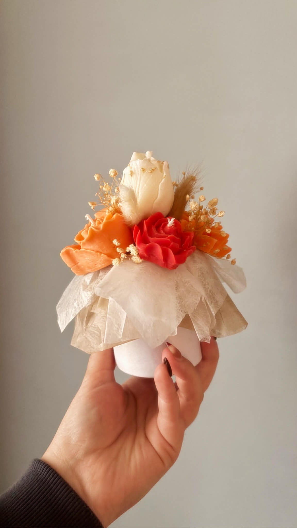 Dit schattige, handgemaakte kaarsjesboeket brengt direct warmte en gezelligheid in huis. Perfect om subtiel een romantische of sfeervolle touch aan je interieur te geven, of om cadeau te doen aan iemand die je dierbaar is. Kan decoratief blijven staan of gebruikt worden om de kaarsjes los in een waterbokaaltje te laten drijven voor een magische gloed.