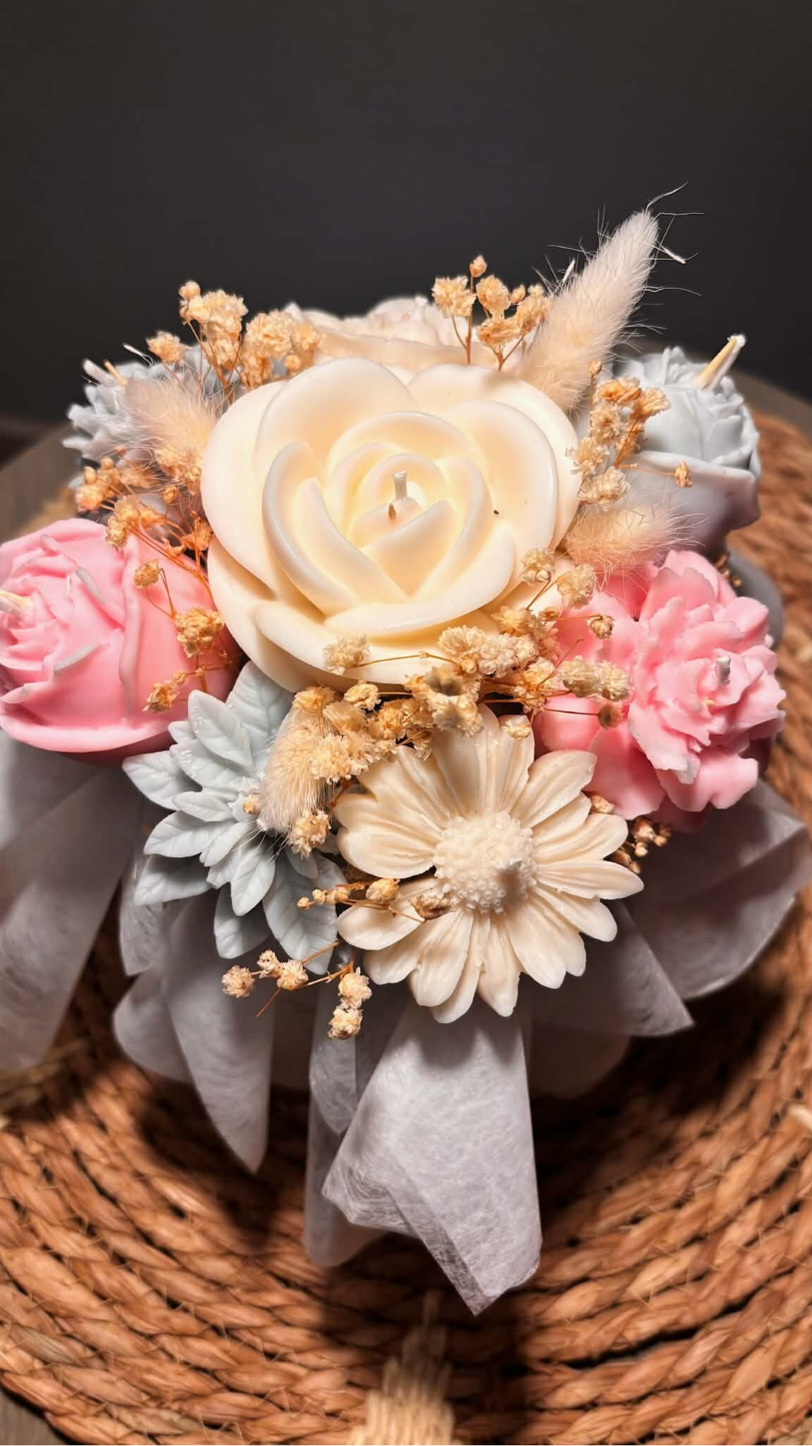 Maak je interieur extra sfeervol met dit grote, handgemaakte kaarsjesboeket. Perfect als eyecatcher op tafel of dressoir, of als romantisch cadeau. Laat het decoratief staan voor een gezellig accent, of haal de kaarsjes eruit en laat ze drijven in een waterbokaaltje voor een magische, warme gloed die direct kerstsfeer of romantiek toevoegt.